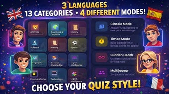 Quiz Battle - Jogo de Trivia é um jogo de trivia gratuito que oferece uma mistura de aprendizado e competição social. Ele apresenta treze categorias de quiz, como geografia, ciência e música, tornando-se uma escolha flexível para jogadores solo ou grupos. O jogo educacional se concentra em fornecer uma maneira limpa e acessível de testar sua memória.